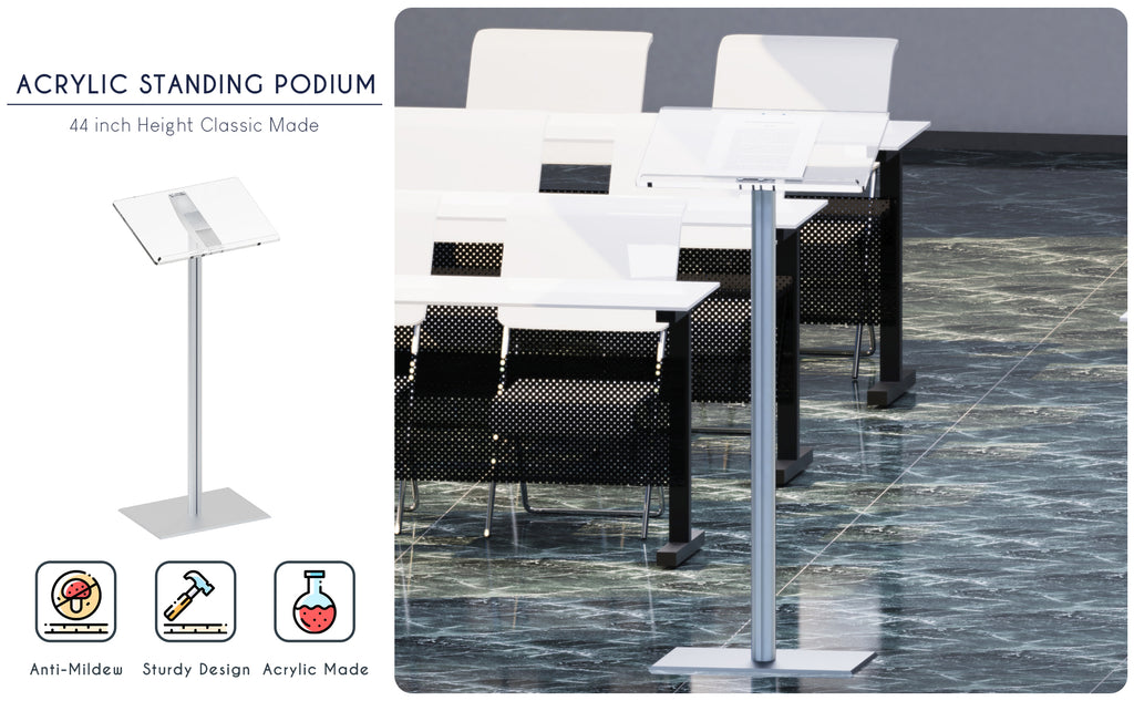 - METAL SUPPORT PODIUM: Made of clear acrylic with strong metal support, will not rust or corrode, is strong and durable. The whole stand is 18.5 inch long 13 inch deep 44 inch height and capable of maximum holding 33lb.