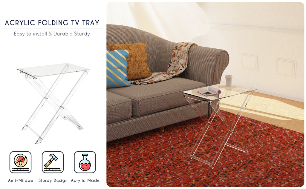 - FOLDING TV TRAY TABLE: Made of clear acrylic, will not rust or corrode, is strong and durable. The whole TV Tray Set is 18.6 inch long 11.8 inch deep 20.4 inch height and capable of maximum holding 33lb.